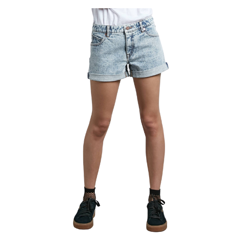 The perfect denim style, the Stoned Short Rolled is a comfy boyfriend fit with a rolled, tacked cuff. Includes our Volcom Stone coin pocket. Spliced waistband and logo'd metal hardware.